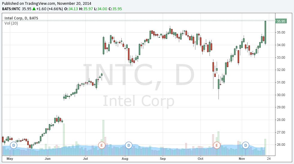 Intel also provided its outlook for 2015. The chip giant is expecting revenue growth in the mid-single-digits, gross margin percentage at 62% (+/- two points), and R&D plus MG&A spending “to be down with spending of approximately $20 billion, plus or minus $400 million.” Capital spending is targeted at $10.5 billion, plus or minus $400 million. The outlook was fantastic, in our view. Revenue growth was better than expected, R&D/MG&A spending is slowing, and the firm is cutting its capex relative to last year, which should bolster free cash flow. We think Intel is being conservative with its gross margin guidance as it sorts through the value chain in advance of negotiations for the oncoming year.