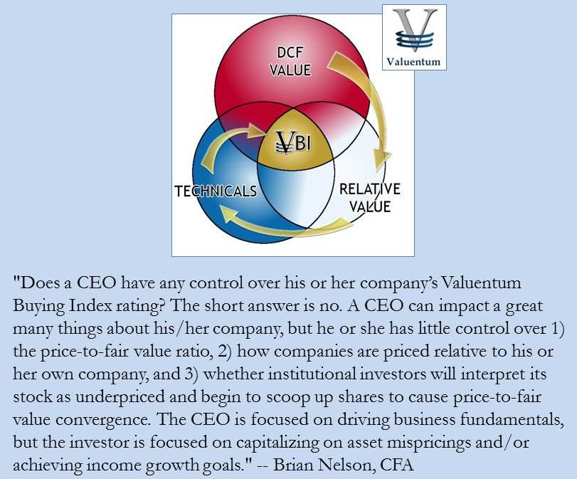Identifying stocks that are trading at a large discount to a discounted cash-flow-based intrinsic value estimate and versus peers is only part of investing, however. Eventually we want those stocks to converge to our estimate of their intrinsic value — and in order for a stock to converge to intrinsic value, other investors must purchase that stock, driving its stock price higher. This represents the basic building blocks of any market. When large institutional investors start purchasing a company’s stock, it takes time for them to fill their entire positions. Therefore, underpriced stocks that are being purchased by institutional buyers will tend to continue to exhibit strong price momentum for some time into the future. This increases the likelihood of what we describe as price-to-fair value convergence. A stock that is undervalued both on a discounted cash-flow basis and relative valuation basis and has just started to exhibit strong technical and momentum indicators scores high on the Valuentum Buying Index.