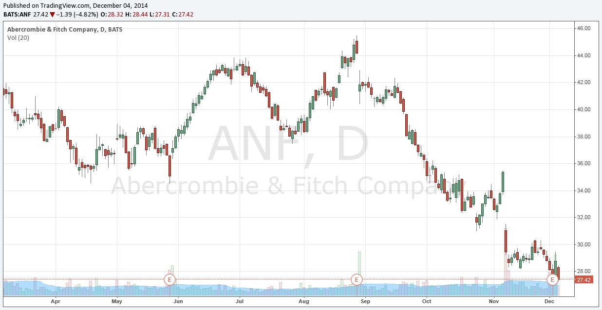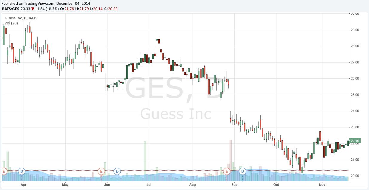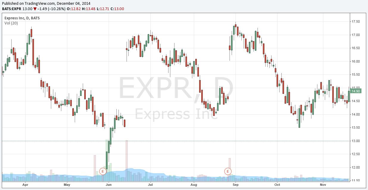 Net sales in the third quarter at Express fell 1%, while comparable sales during the quarter dropped 5%, compared to a 5% jump in last year’s quarter. The company’s full-year guidance came in lower than what many had been expecting: $0.69-$0.76 per share versus $0.82 per share consensus and $1.37 per share last year. Comparable sales for the full-year are anticipated to be in the negative mid-to-high single-digit range, which offers little hope for improvement from the 7% slide through the first nine months of 2014.