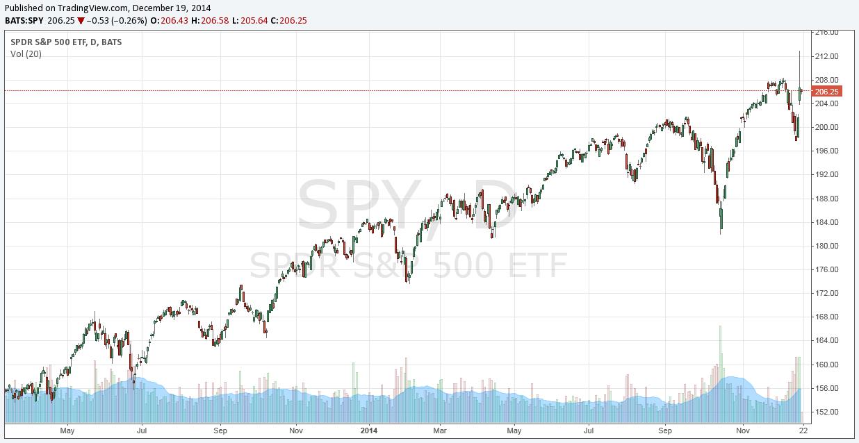 Call it window dressing. Call it drinking at the Fed’s punch bowl. Call it what you will. But the Dow Jones Industrial Average (DIA) polished off its biggest two-day gain in six years to propel itself back to near all-time highs again. The S&P 500 (SPY), shown above, is now within throwing distance of setting new record ground, and spirits remain high as we approach the Christmas holiday and New Year. Collapsing prices at the gas pump, though highlighting risks to global economic growth, may be helping to spread the holiday cheer.