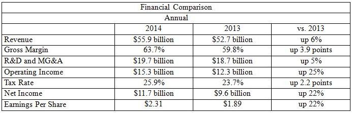 Management commentary was also encouraging: “We met or exceeded several important goals: reinvigorated the PC business, grew the Data Center business, established a footprint in tablets, and drove growth and innovation in new areas. There is more to do in 2015. We’ll improve our profitability in mobile, and keep Intel focused on the next wave of computing.” The outlook for 2015 was also rather solid: revenue growth in the mid-single-digit range, gross margins of 62% +/- a couple percentage points, and full year capital spending of $10 billion +/- $500 million.