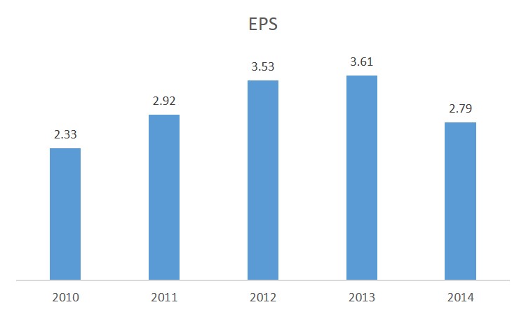 Still, we value Coach’s shares at $50 each and think upside potential is far greater than downside risk at present levels. Our thesis rests on an eventual recovery in its North American women’s handbag business and the belief that earnings will normalize at levels much higher than today’s run-rate (look at its annual earnings performance in recent years below). At the end of March 2015, Coach had $2.02 billion in cash and short-term investments and ~$890 million in long-term debt.