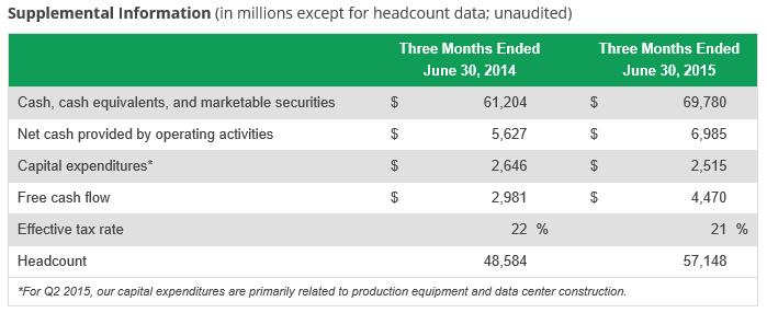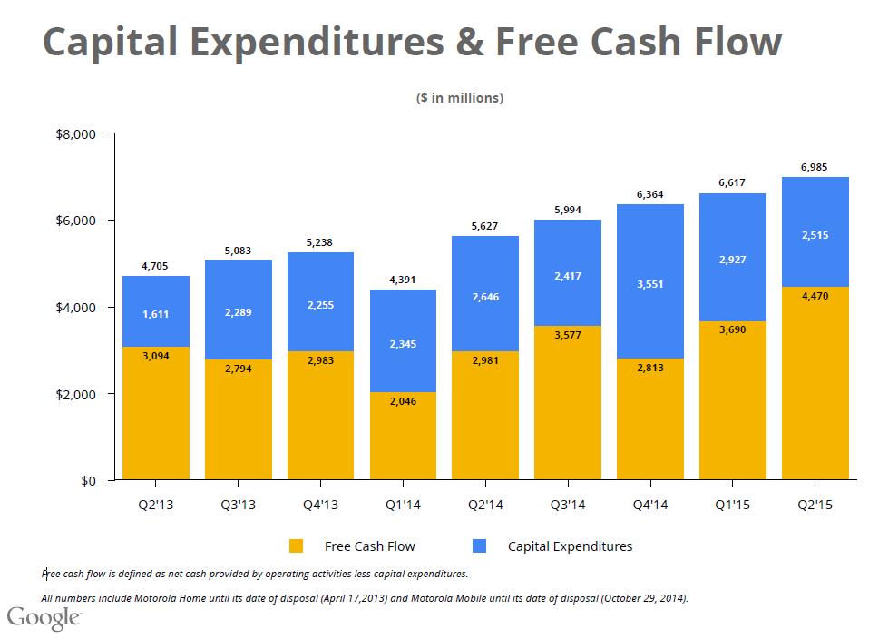 Google’s financial profile continues to be one of the best in our coverage universe. A cash balance of nearly $70 billion showcases the firm’s tremendous financial flexibility; its short and long-term debt was just over $5 billion at the end of the second quarter. Cash flow generating from operating activities expanded nicely on a year-over-year basis during the period, while free cash flow jumped nearly $1.5 billion from the June 2014 quarter, as the image above shows.