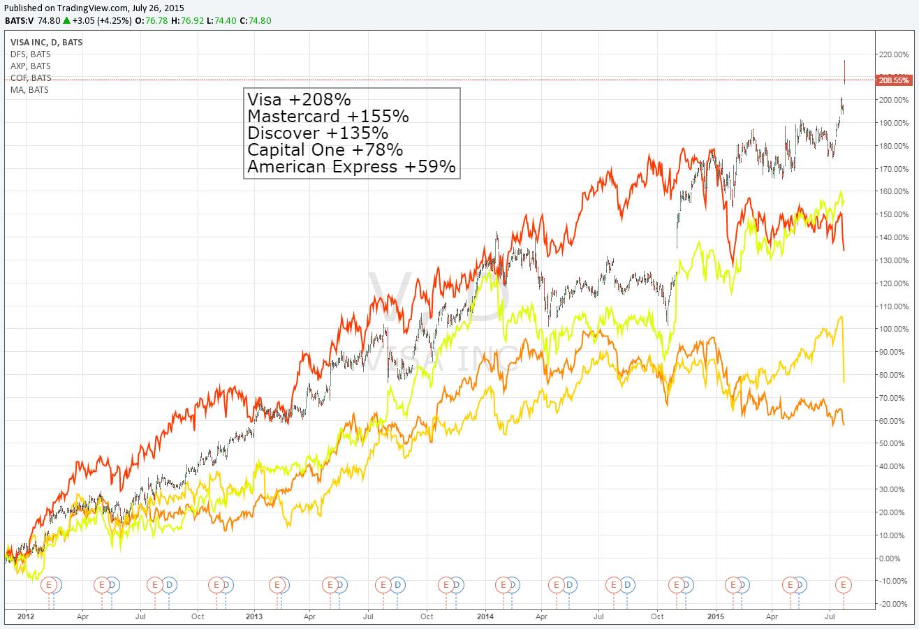 It’s hard to go wrong with exposure to the credit-card processing arena. Investors have made a lot of money in Visa (V), MasterCard (MA), Discover Financial (DFS), American Express (AXP) and Capital One (COF) during the past several years, but they’ve made the most with Best Ideas Newsletter portfolio holding Visa. Since Visa was added in November 30, 2011, the company has more than tripled, a return that is more than 50 percentage points better than MasterCard’s, more than 70 percentage points better than Discover’s, more than 120 percentage points better than Capital One’s, and about 150 percentage points better than American Express’. All have done well, but Visa has done the best.