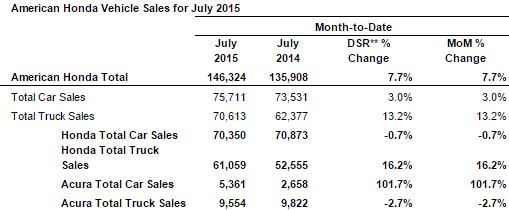 Honda reported robust vehicle sales growth of 7.7% in the month of July, as it sold 146,324 Honda and Acura vehicles. The Honda division grew sales by 6.5%, and the firm sold 19.5% more Acura brand vehicles compared to July 2014. The company advanced its truck and SUV sales 13.2% in the month and broke its July sales record for the segment.