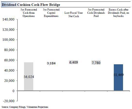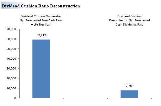 Please note that to arrive at the Dividend Cushion score, divide the numerator by the denominator in the graph below. The difference between the numerator and denominator is the firm’s “total cumulative 5-year forecasted distributable excess cash after dividends paid, ex buybacks.”