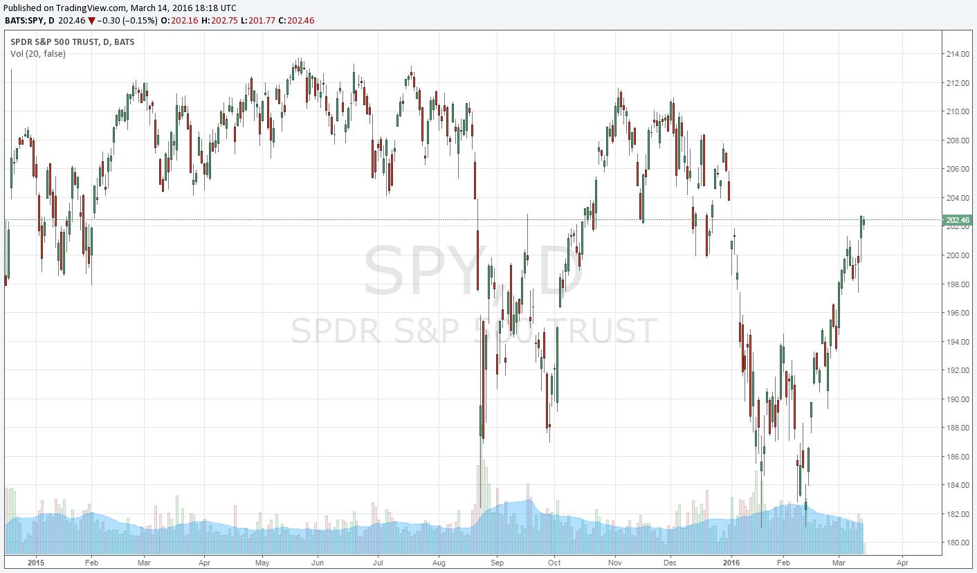 The above is a trailing 15-month chart of the broad market index, the S&P 500 (SPY).