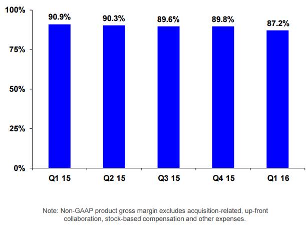 Shown: Pricing pressure continues to hurt Gilead’s gross margin; source: Gilead’s first-quarter 2016 presentation.