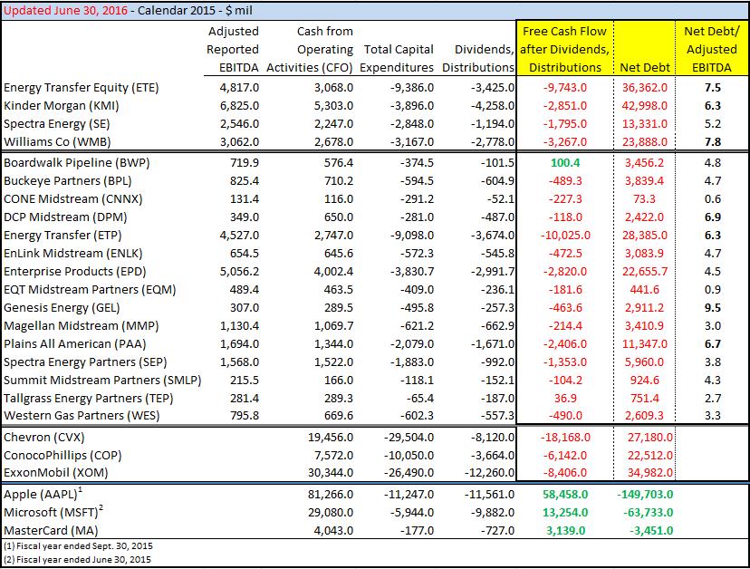 Though it may not happen anytime soon, we believe there will eventually be an “investor-led” crusade against this dangerous business model. Such opposition doesn’t necessarily have to come from investors either. It could come from a corporate coalition. There are many corporates, for example, that have decent balance sheets and cover their dividends with traditional free cash flow, but have much less sanguine credit marks by the agencies relative to those of such overleveraged, “cash-burning” (after dividend payments) pipeline MLP plays. Moreover, we believe the SEC should take a hard look at the industry’s definition of “cash flow,” which we believe is very misleading to even the most sophisticated investors. In particular, an MLP’s definition of distributable cash flow excludes the very growth capital spending that drives net income, which itself is included in the calculation of distributable cash flow. When analysts use distributable cash flow in valuation, they, by its very own definition, exclude a portion of the cash capital outflows (shareholder money) that are used to drive net income higher, a severe imbalance in the valuation equation.
