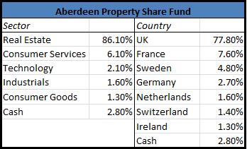 The Aberdeen Property Share Fund does not invest directly into commercial real estate assets. Instead it invests mostly in UK real estate companies but also has exposure to other sectors and countries, mostly in Europe. The most recent breakdown of exposure can be seen in the chart above. The fund was launched in 1990.