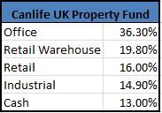 The Canlife UK Property Fund invests directly in the property market by buying and selling commercial property in the UK, the most recently reported breakdown of which can be seen above. It has been in existence since 1975.