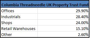The Columbia Threadneedle UK Property Trust Fund will typically invest at least two-thirds of its assets in commercial real estate in the UK, and may also invest in shares, bonds, gilts, and other funds. The most recently reported breakdown of sector exposure can be seen in the chart above. The fund was initiated in 2007.