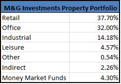The M&G Investments Property Portfolio invests in a diversified portfolio of commercial property, primarily in the UK, but also may invest in other property related assets, which can include collective investment schemes, transferable securities, derivatives, debt instruments, government debt, and money market instruments. The most recently reported breakdown of the fund’s sector exposure can be seen above. The fund has been in existence since 2013.