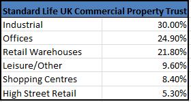 The Standard Life UK Commercial Property Trust holds a diversified portfolio of commercial property in the UK, the most recently reported sector exposure breakdown of which can be seen in the chart above. The trust was initiated in 2006.