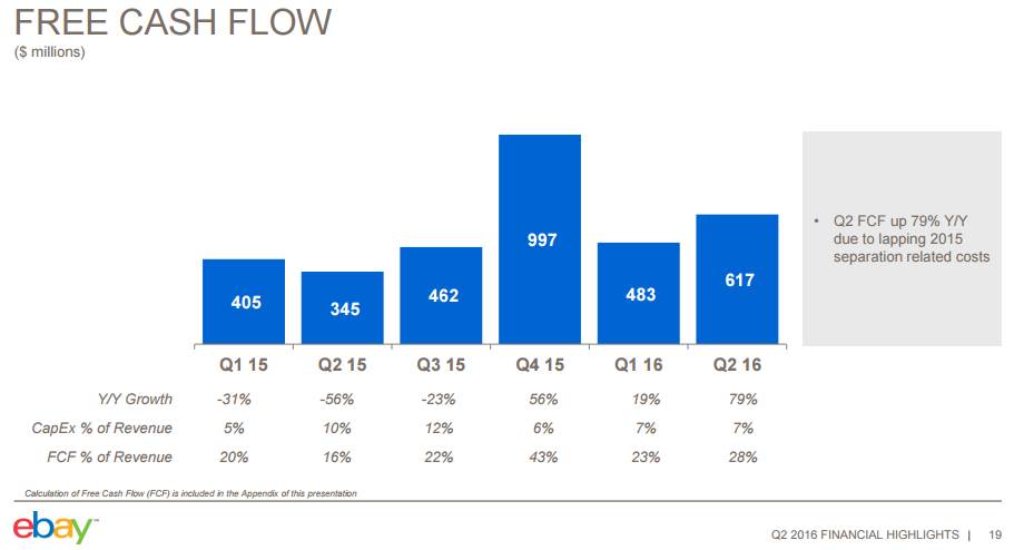 During the past three years, eBay has generated in excess of $2.2 billion of free cash flow, and we think it will exceed that mark in 2016 as well, as it remains on pace to do so with the holiday season still ahead of us for the year (it generated almost a $1 billion of free cash flow in the fourth quarter of 2015 alone). Management has been guiding free cash flow in the range of $2.2-$2.4 billion for 2016, but that may very well be conservative. The company only holds a modest net debt position of ~$1 billion on the balance sheet, with cash and short-term investments standing at ~$8.1 billion at the end of the quarter. A leveraged buyout of eBay at market, or with an enterprise value of ~$35 billion, still makes a lot of sense, in our opinion. eBay still sports a conservative free cash flow yield of ~7%, and its business is growing! Even if eBay doesn’t get bought out though, can you imagine the pop in the stock if it establishes a run-rate dividend near its free cash flow generation capacity?