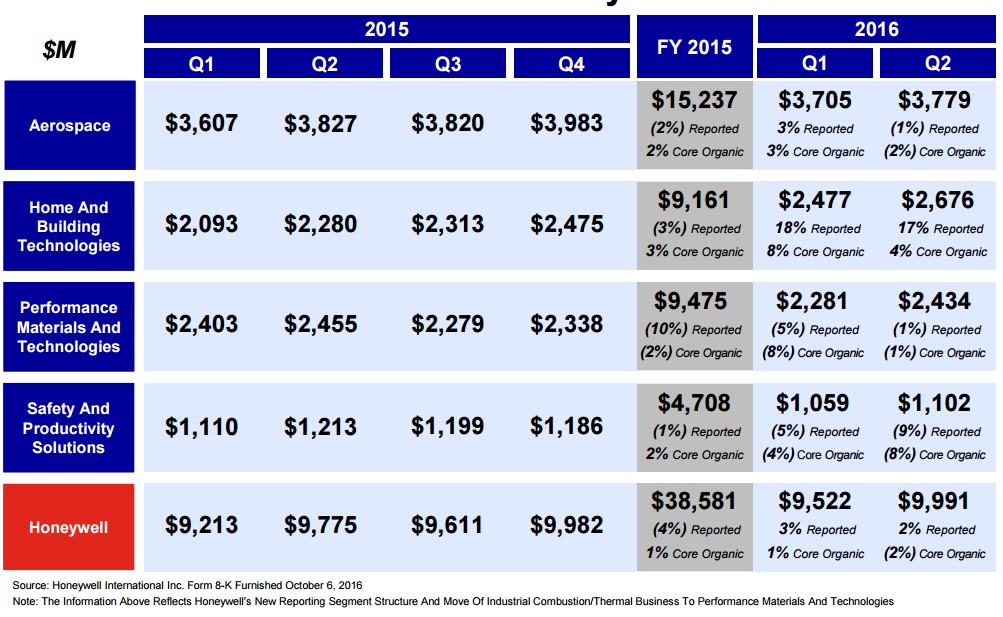 One thing remains: Honeywell continues to be an M&A story, as organic growth trends have been under pressure as a result of a global economy that has failed to stack up to expectations. During the past 15 years, for example, Honeywell has completed ~90 acquisitions and divested ~70 businesses. In 2015 alone, the company spent ~$5.8 billion in cash for the acquisitions of Elster, ComDev, Satcom, Sigma, and Aviaso. In August 2016, Honeywell completed the buyout of Intelligrated (automation solutions business), and unconfirmed reports suggest it is interested in acquiring JDA Software for $3 billion. Honeywell also spun-off AdvanSix (ASIX), its resins and chemicals operation, where shareholders received one share of AdvanSix for every 25 shares of common Honeywell stock they owned. It recently sold its government service provider to KBR (KBR).