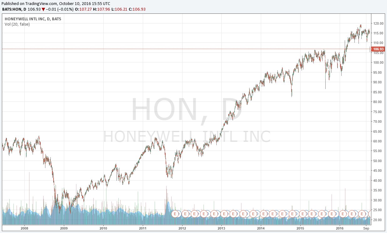 What a wonderful ride it has been these past seven years from the March 2009 panic bottom. The S&P 500 (SPY) has experienced one of its strongest showings in history during this time, and even large caps have posted returns that have turned heads. The share price of Honeywell (HON), for one, has leapt more than 170% since the end of 2009, simply a huge run for a company of its size. The question, however, on everyone’s mind: Will Honeywell continue to set new heights, or will the ballast of the economic cycle begin to weigh on shares? Longtime CEO Dave Cote will step down March 2017. Will a more ominous picture begin to form as new management gets settled in?