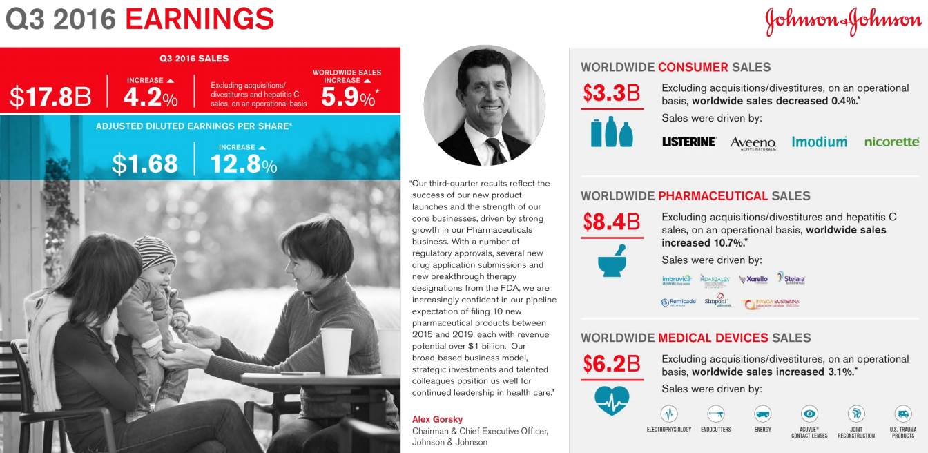 Best Ideas Newsletter portfolio and Dividend Growth Newsletter portfolio holding Johnson & Johnson’s (JNJ) third quarter report October 18 was an impressive display of the success of its new product launches and the strength of its ‘Pharmaceutical’ business, which it expects is only just heating up. Johnson & Johnson is a long-time holding in the Dividend Growth Newsletter portfolio and was recently added to the Best Ideas Newsletter portfolio in January 2016 as a diversified pharma replacement for the more speculative Gilead (GILD), “Alerts: High-grading! GILD–>JNJ; EBAY–>FB (January 2016),” “The J&J-Gilead Trade-off Update (July 2016).” We see no reason to adjust our positions in Johnson & Johnson in either newsletter portfolio following the solid report.