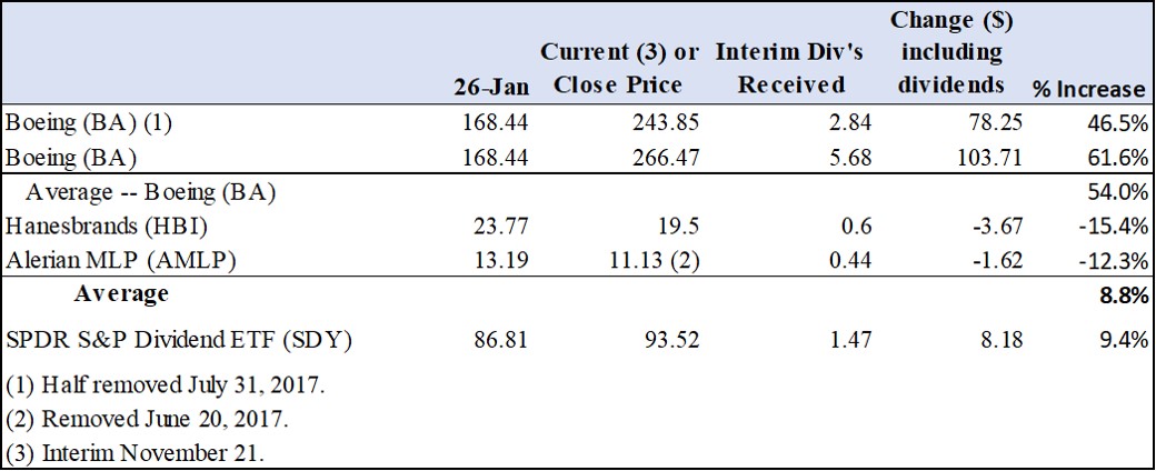 Quickly, I wanted to run through the outcome of one of the email notification ideas we presented as it relates to the Dividend Growth Newsletter portfolio January 26, 2017 (here). First and foremost, it hasn’t worked out as good as some of our other ideas, and we made an unforced error in the Alerian MLP (AMLP)–because we know we don’t like the group, generally–and Hanesbrands (HBI) continues to be beaten down unfairly, in my view. But to be completely fair to us, we haven’t heard much about Boeing (BA). Boeing’s shares have been among the best performing in the Dow Jones Industrial Average this year and surpassed General Electric (GE) as the largest industrial.