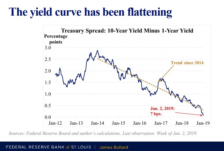 On January 10, President and CEO of the Federal Reserve Bank of St. Louis, James Bullard offered a number of perspectives on 2019 monetary policy. You can download his slide deck here (pdf). Bullard predicts that inflation will come in on the “low side” of expectations in 2019, viewing this as a signal that “US monetary policy may be overly hawkish (too aggressive in raising rates).” He also believes that “the prospect for a further global growth slowdown is tangible,” and notes the “bearish signal” an inverted yield curve may send.
