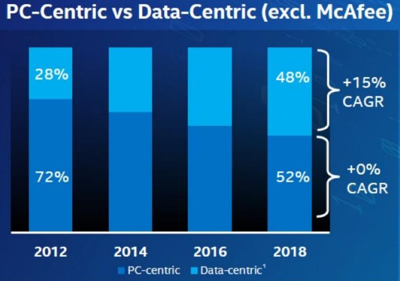 Image shown: Intel’s revenue mix continues to shift towards its data-centric businesses and away from its PC-centric business. Source: Intel fourth quarter presentation