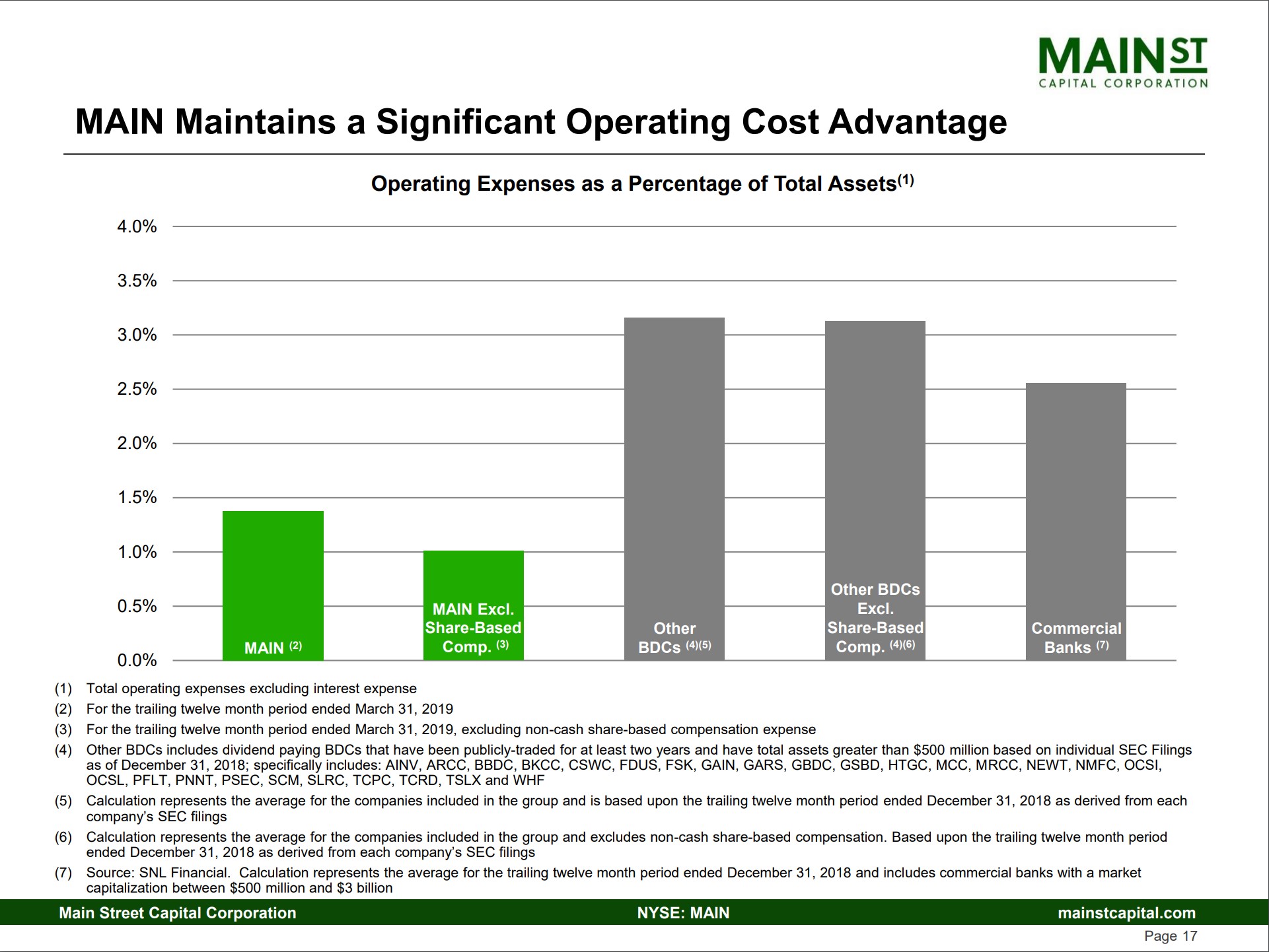 If I were to pick one Business Development Company to highlight, it would be Main Street Capital (MAIN). Let’s go through some of the most important metrics below to see why they bubble up to the top in terms of BDC quality. First off, you can see below that MAIN operates with a lean operating expense structure. Just as with a bank, this is important in terms of translating revenues into earnings and dividends.