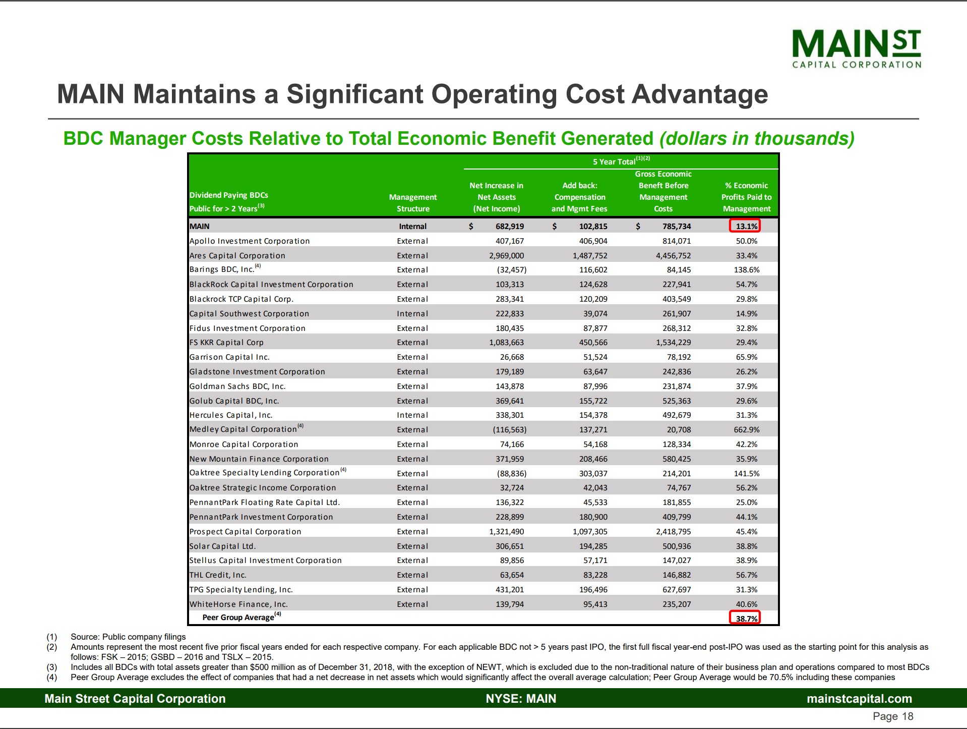 As you can see below, MAIN’s percent of economic profits paid to management is significantly lower than most of its peers. You can also see in the below graphic that the management teams of some BDCs are really hoarding much of the value creation they are able to generate!