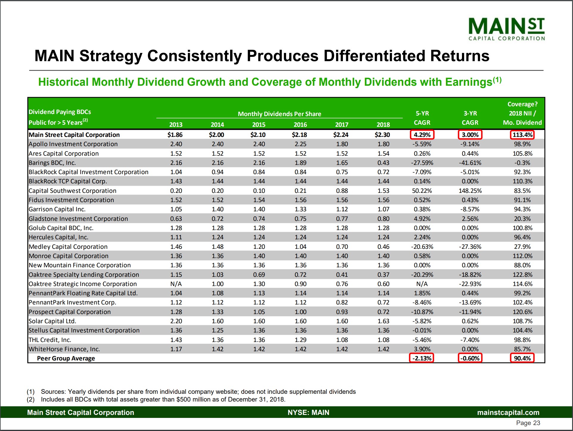 You can also see in the below graphic that Main Street Capital has been able to grow its dividend stream better than most of its peers. The dividends are also covered by Net Investment Income, speaking to the sustainability of the payout.