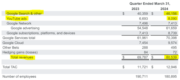 Our results in the first quarter reflect strong performance from Search, YouTube and Cloud. We are well under way with our Gemini era and there’s great momentum across the company. Our leadership in AI research and infrastructure, and our global product footprint, position us well for the next wave of AI innovation…Our strong financial results for the first quarter reflect revenue strength across the company and ongoing efforts to durably reengineer our cost base. We delivered revenues of $80.5 billion, up 15% year-on-year, and operating margin expansion.