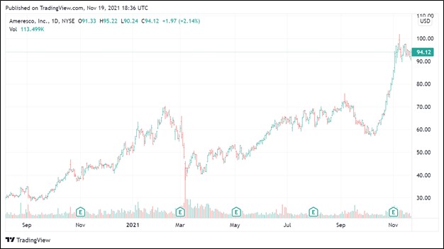 Image Shown: Shares of Ameresco Inc have boomed higher since we first wrote about the company on V.com back in August 2020. We include Ameresco as an idea in our ESG Newsletter portfolio and see ample room for further capital appreciation upside.