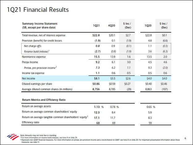 Image Shown: Bank of America’s bottom-line received a massive boost in the first quarter of 2021 due primarily to a large reserve release, money previously set aside for potential loan losses. The US economy has fared better than initially expected so far during the COVID-19 pandemic and with vaccine distribution efforts now well underway, there is room to keep the momentum going in the right direction. Image Source: Bank of America – First Quarter of 2021 IR Earnings Presentation