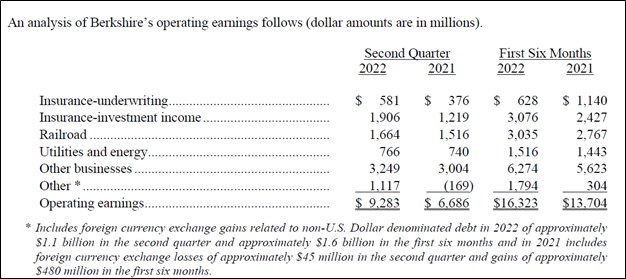 Berkshire Hathaway’s operating earnings rose 39% year-over-year in the second quarter of 2022 to reach $9.3 billion. All of its core business reporting segments reported nice operating earnings growth last quarter on a year-over-year basis including its ‘Insurance-underwriting’ (up 55%), ‘Investment-investment income’ (up 56%), ‘Railroad’ (up 10%), ‘Utilities and energy’ (up 4%), and ‘Other businesses’ (up 8%) segments. Its ‘Other’ business reporting segment swung from a loss in the same period last year to a gain in the second quarter of 2022 due largely to gains from non-US dollar-denominated debt as the US dollar has been quite strong of late. We appreciate the widespread strength seen across Berkshire Hathaway’s business portfolio last quarter.