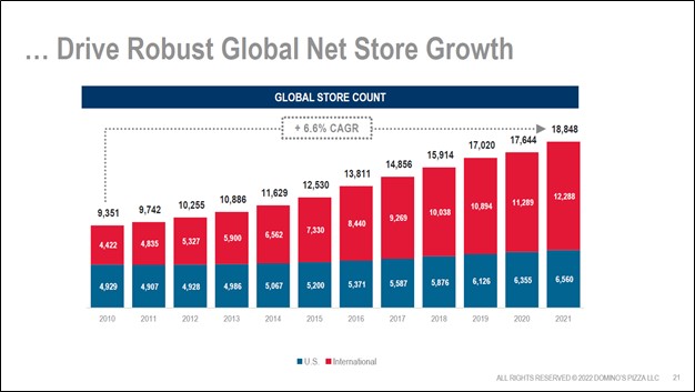 Image Shown: Domino’s has seen its global store count grow rapidly over the past decade. Image Source: Domino’s – Fourth Quarter of Fiscal 2021 IR Earnings Presentation