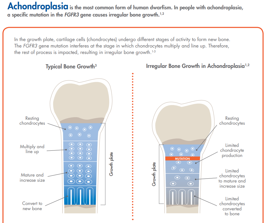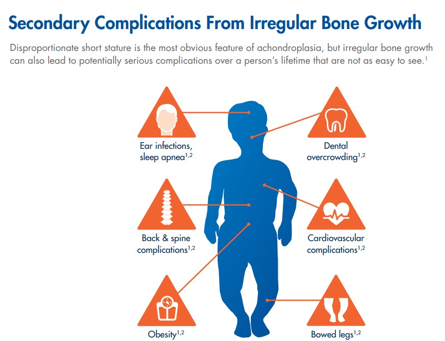 The FGFR3 gene mutation, as described in the image immediately preceding, leads to irregular bone growth that manifests itself into a wide range of ailments for those afflicted with Achondroplasia (outside of short stature). The most common side effects are back and spine problems as many will have a form of scoliosis (curvature of the spine). The shorter trunk commonly found in the patient class will also lead to organ issues as the organs will grow to full size while the short trunk will often lead to cardiac complications. Achondroplasia is the most common type of dwarfism.