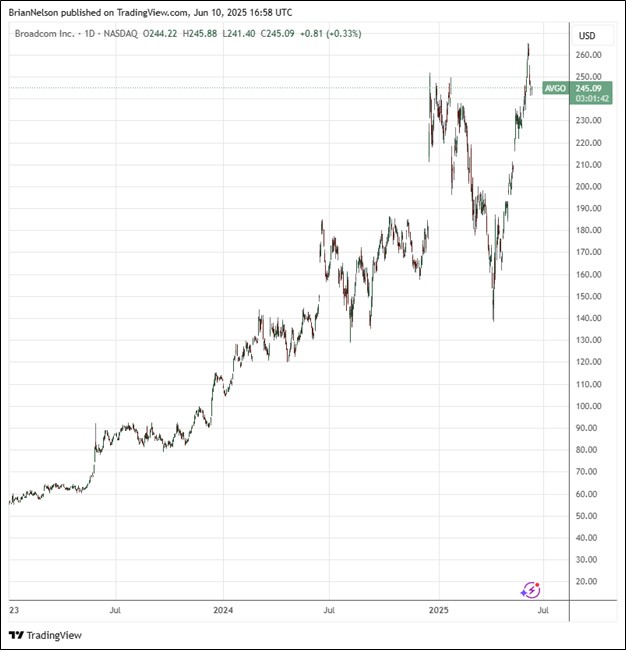 On June 5, Broadcom (AVGO) reported second quarter fiscal 2025 results that came in better than expected on both the top and bottom lines. Revenue increased 20% from the same period a year ago, to $15 billion, while non-GAAP net income came in at $7.8 billion, up from $5.4 billion in the same period last year. Adjusted EBITDA of $10 billion was 67% of revenue and better than the $7.4 billion achieved in last year’s quarter. Non-GAAP diluted earnings per share was $1.58 for the second quarter versus $1.10 in last year’s quarter.