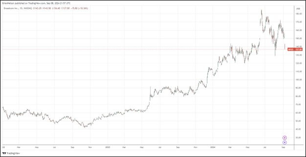 Looking to the fourth quarter of fiscal 2024, Broadcom expects revenue of approximately $14 billion, and fourth-quarter adjusted EBITDA of approximately 64% of projected revenue, or $8.96 billion. Though the firm’s revenue guidance for the fourth quarter wasn’t poor, it did come in lower than the $14.13 billion that the Street was expecting, and shares were punished as a result. We’re not reading much into one quarterly report, however, and we maintain that trends in artificial intelligence are prolific.
