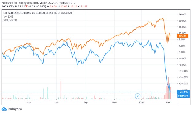 In the upcoming graphic down below please note the hefty underperformance of the U.S. Global Jets ETF (JETS), which owns a basket of commercial passenger airline stocks, relative to the S&P 500 Index (SPY) over the past year.