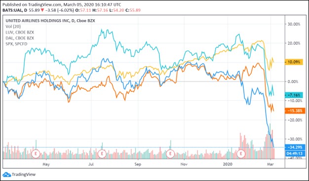 Image Shown: The S&P 500 index is shown by the yellow line, Delta Air Lines is shown by the cyan line, Southwest Airlines is shown by the orange line, and United Airlines is shown by the blue line as it relates to the performance of this index and these equities over the past year. Clearly, airlines have had a rough time of late, but again this is nothing new.