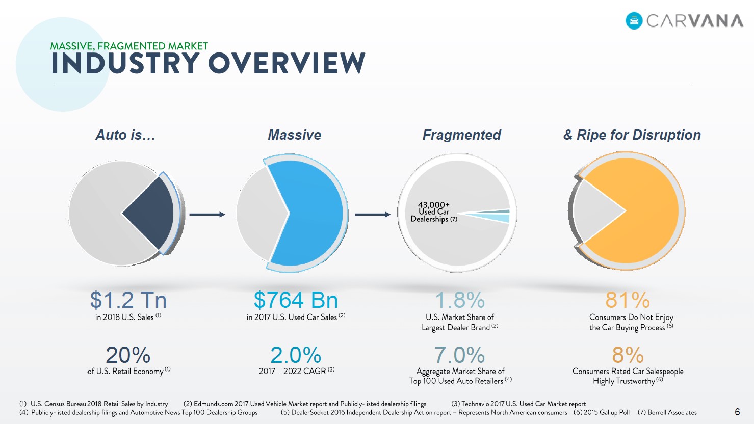 The company noted that the US used auto sales market clocked in at $764 billion in 2017 according to third-party auto market data research provider Edmunds.com Inc. This is a market that Carvana noted another third-party market research provider sees as growing by 2% CAGR from 2017-2022. There are over 43,000 used car dealerships in the US, making this a highly fragmented market and one ripe for disruption. Carvana further highlights how most consumers aren’t satisfied with the way the entire used automobile sales process is handled.