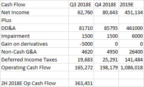 Centennial Resource generated $311.4 million in adjusted operating cash flow during the first half of 2018, which doesn’t take into account working capital changes (which were positive during that period). Note that Centennial Resource plans on spending roughly $970 million this year on capital expenditures. Exhibit C highlights our operating cash flow assumptions for the second half of 2018 and for 2019. Under the assumptions given in Exhibit B and the income statement shown in Exhibit A, we assume Centennial Resource generates $363.5 million in operating cash flow during the second half of 2018. That still indicates Centennial Resource would need to utilize roughly $300 million in outside funding to cover its probable outstand. The goal of this outspend is to ramp up its production base to levels where the company can be entirely self-funded, an event which should trigger significant capital appreciation.