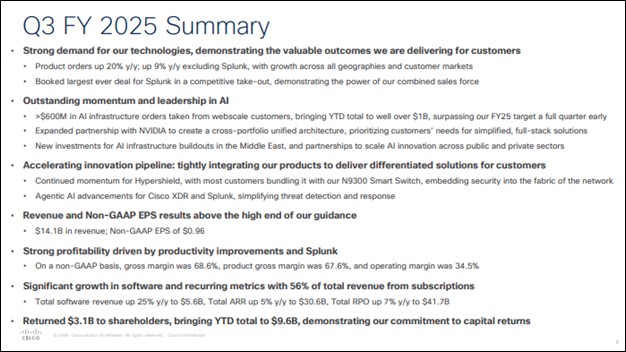 On May 14, Cisco Systems (CSCO) reported better than expected third quarter fiscal 2025 results, with both revenue and non-GAAP earnings per share coming in higher than the consensus forecast. Revenue increased 11% year-over-year, while non-GAAP earnings per share increased 9% year-over-year, to $0.96 per share, above the high end of its guidance range ($0.90-$0.92). Product orders expanded 20% from the same period a year ago (9% excluding Splunk), while AI infrastructure orders taken from webscale customers exceeded $600 million.