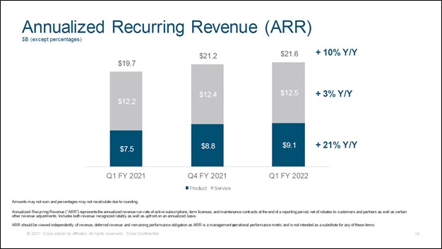 There were some bright spots in Cisco Systems’ latest earnings update as its management team noted that “remaining performance obligations and annualized recurring revenue [‘ARR’] both grew 10% year over year with product ARR growth of 21% providing more predictability and visibility to our long-term growth” within its latest earnings press release. Building up its recurring revenue streams is a major focus for Cisco Systems, and the firm laid out its strategy on this front during a big investor day event in September 2021.