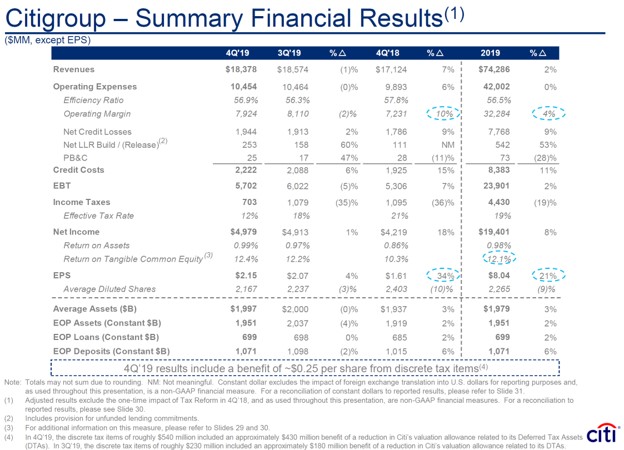 Citigroup is finally out-earning our estimate of its cost of capital with a return on tangible common equity (ROTCE) of 12.4% in the quarter, and the shares have rallied substantially more recently as a result. Management lowered expectations for the degree of return on tangible equity improvement going into 2020, but continued improvements would be welcome, nonetheless.