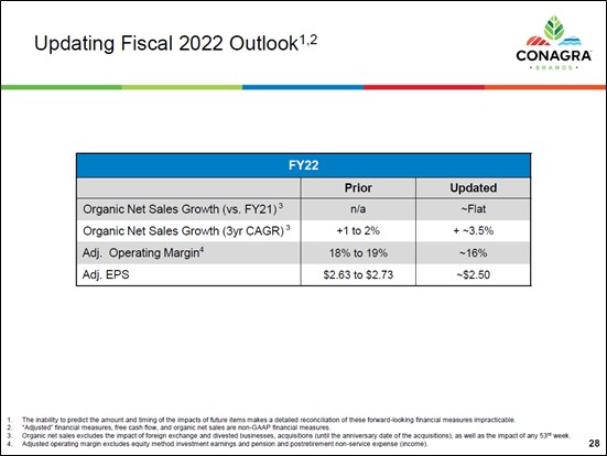 Image Shown: Conagra Brands Inc recently reduced its full-year guidance for fiscal 2022 in the face of major inflationary headwinds. Image Source: Conagra Brands Inc – Fourth Quarter of Fiscal 2021 IR Earnings Presentation