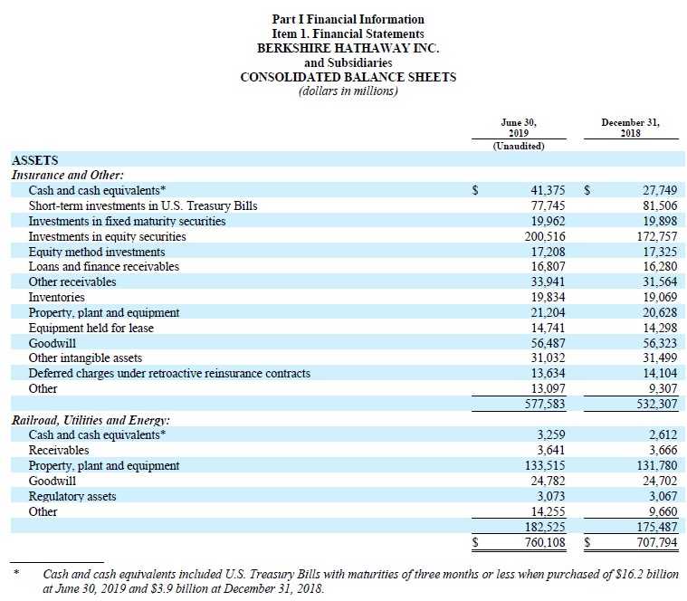 Image Shown: Berkshire Hathaway’s balance sheet can be a tricky read given its large insurance operations. Image Source: Berkshire Hathaway – Second quarter 2019 10-Q filing
