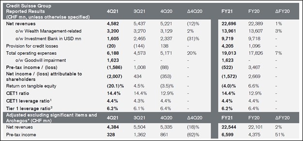 On February 10, Credit Suisse reported a lackluster fourth quarter 2021 earnings update.