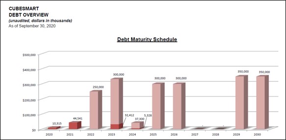 Image Shown: A look at CubeSmart’s debt maturity schedule as of the end of September 2020. Please note this picture does not take more recent refinancing activities into account, though we appreciate the staggered nature of its debt maturity schedule. Image Source: CubeSmart – Financial Supplement covering the third quarter of 2020
