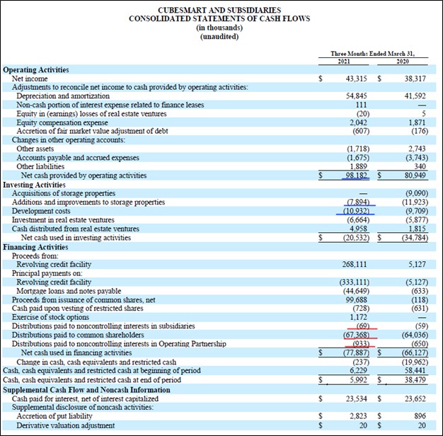 Image Shown: Line-items concerning CubeSmart’s free cash flow performance are underlined in blue and line-items concerning the REIT’s payout obligations are underlined in red. Image Source: CubeSmart – 10-Q SEC filing covering the first quarter of 2021