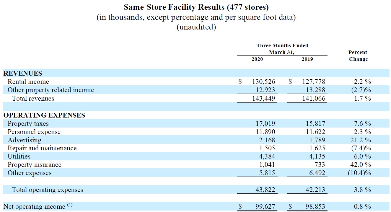 In the first quarter of this year, Cube-Smart was able to grow its same-store total revenues by almost 2% versus the same quarter the prior year, though a near 4% increase in its total operating expenses held down its same-store net operating income (‘NOI’) growth during this period. Going forward, the negative impact the ongoing coronavirus is having on rent collection will likely put a moderate amount of pressure on CubeSmart’s financials in the short term. Management noted this in CubeSmart’s earnings press release (emphasis added):