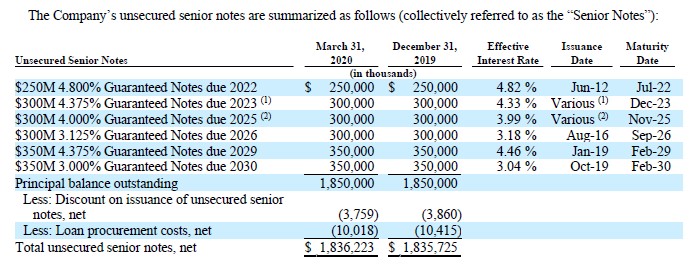 Image Shown: CubeSmart’s debt maturity schedule is staggered, making refinancing activities a more manageable task. Image Source: CubeSmart – 10-Q filing covering the first quarter of 2020